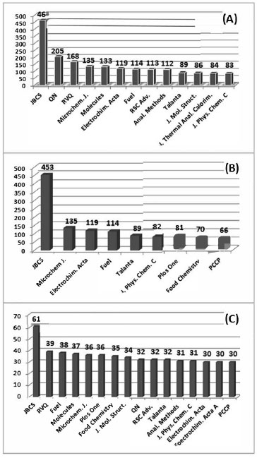 ![]() Figura 1. (A) Periódicos com maior número de publicaçoes pela PG em Química no Brasil no biênio 2013/2014, com os respectivos números totais de artigo publicados em cada periódico; (B) número total de artigos publicados pelos PPGQs nas revistas mais bem publicadas e classificadas no extrato A do Qualis-CAPES, no biênio 2013/2014; (C) número de PPGQ que publicaram nas revistas mais procuradas pelos PPGQ no biênio 2013/2014
