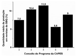 ![]() Figura 2. Porcentagem média da produçao total dos diferentes PPGQs no ano de 2015 nas revistas da SBQ, agrupados de acordo com os conceitos da CAPES