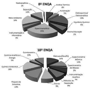Do 1º ao 18º ENQA, o número de trabalhos apresentados foi quase sempre crescente, passando de 136 para 1011, respectivamente. Hoje, o ENQA é considerado o evento de Química Analítica mais importante da América Latina. As três últimas ediçoes contaram com mais de 1000 participantes do Brasil e também de outros países. Um panorama geral da Química Analítica brasileira pode ser obtido observando-se a distribuiçao de trabalhos apresentados no ENQA, uma vez que é possível avaliar as subáreas que mais se destacam no cenário nacional e também linhas de pesquisa em ascensao. A Química Analítica está em constante transformaçao em funçao de novas demandas e dos desenvolvimentos tecnológicos que abrem novas possibilidades de pesquisa. Para avaliar essa evoluçao, é comparada a distribuiçao de trabalhos por temas no 8º ENQA (1995) e no 18º ENQA (2016) (Figura 3). Em 1995, 75% dos trabalhos apresentados no 8º ENQA eram das subáreas de espectroanalítica, eletroanalítica, química ambiental e técnicas de separaçao. O número de trabalhos envolvendo automaçao, instrumentaçao e informática era pequeno (8%). O restante dos trabalhos se dividia nas áreas de análise térmica, equilíbrio químico, educaçao em química e radioanalítica.