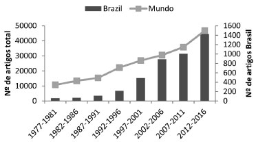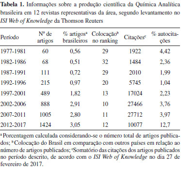![]() Figura 4. Número de artigos total e de artigos publicados por brasileiros no período de 1977 a 2016 em doze importantes revistas de Química Analítica, segundo levantamento no ISI Web of Knowledge da Thomson Reuters