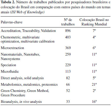 TENDENCIAS E DESAFIOS Nos últimos 40 anos, a ciência no Brasil tem avançado a passos largos e a Química Analítica acompanhou esse avanço, como pode ser verificado pelos dados apresentados. É inegável que alcançamos um novo patamar e ocupamos um lugar de destaque no cenário internacional. A formaçao de recursos humanos, os investimentos em infraestrutura, a organizaçao das sociedades científicas e as políticas indutoras estabelecidas principalmente pela CAPES e pelo CNPq tiveram papel fundamental nessa evoluçao, assim como a consolidaçao de agências de fomento estaduais. Os dados também possibilitam inferir que avançamos mais em termos quantitativos que qualitativos. Assim, nosso maior desafio, como produtores de ciência, tecnologia e inovaçao no Brasil, é elevar a qualidade e o impacto da produçao científica e tecnológica do país. Para isso é importante trabalhar nas fronteiras do conhecimento, acompanhando tendências e buscando inovaçoes. A Química Analítica é uma área que permeia e interage com várias outras áreas do conhecimento e isso aumenta as possibilidades de crescimento e também os desafios. Em 2014, a FAPESP publicou em sua revista mensal o texto "Ciência em Evoluçao", reportando um estudo realizado por dois pesquisadores da University London College indicando mudanças na produçao científica mundial.17 De acordo com um dos autores, "Novas áreas científicas trazem com elas novas oportunidades de crescimento e conexoes com outros campos já estabelecidos". Ele comenta ainda sobre o dilema entre apoiar excelência científica em áreas consolidadas e, ao mesmo tempo, seguir novas tendências e garantir a relevância dos seus sistemas de ciência em áreas emergentes. Esse é um desafio pertinente à todas as áreas do conhecimento e caberia uma discussao/reflexao mais aprofundada. A Sociedade Brasileira de Química poderia liderar essa discussao, que seria certamente muito benéfica para nossa comunidade. Esses autores afirmam também que regioes como América Latina e Asia, que apresentam índices de publicaçao altos, mas ainda com impacto relativo mais baixo, caracterizam-se pela maior capacidade de absorver conhecimento utilizando modelos desenvolvidos em outros países. Já as regioes com índices de citaçao mais elevados sao aquelas que estao na fronteira do conhecimento.17 Essa afirmaçao corrobora os dados anteriormente apresentados. A Química Analítica brasileira dispoe de material humano altamente qualificado, tem produzido uma grande quantidade de artigos com um número significativo de citaçoes e, tal como a maioria das áreas em ciências no Brasil, agora precisa avançar na qualidade e no impacto da sua produçao científica. Em 2002 e 2003 foram publicados dois artigos que mostravam os avanços e as tendências da Química Analítica, enfatizando áreas que deveriam ser priorizadas como: bioanalítica, miniaturizaçao, especiaçao química, química analítica de processos, metrologia química, química verde, quimiometria.5,6 Buscou-se entao avaliar o avanço do Brasil nestes temas. Para isso, selecionaram-se algumas palavras-chave e realizou-se uma nova pesquisa na base de dados ISI Web of Knowledge, utilizando-se como filtros a área de Química Analítica e o país, Brasil. O período selecionado para essa pesquisa foi de 2002 a 2016. Compilou-se o número de trabalhos de autores brasileiros publicados nos temas escolhidos e a colocaçao do Brasil em cada uma das áreas em comparaçao com os outros países do mundo (Tabela 2). Em todos os temas, observou-se um aumento crescente de trabalhos publicados no período avaliado. Algumas áreas como microfluídica, nanociências e "Omics" nao haviam sido diretamente mencionadas nos trabalhos publicados há 15 anos. Sao temas atuais que ainda podem ser muito explorados. A microfluídica tem possibilitado a miniaturizaçao de diversos sistemas analíticos, facilitando a portabilidade e as análises in situ. As "Omics" têm ampliado muito o conhecimento sobre os sistemas biológicos, auxiliando, entre outras coisas, na compreensao dos mecanismos relacionados à determinadas doenças e também na busca por novos tratamentos. A Nanociência tem ampliado as possibilidades para sistemas analíticos, mas traz novos desafios como a necessidade de métodos adequados para a determinaçao de impurezas e o controle da produçao de nanomateriais, estudos na área de nanotoxicologia, avaliaçao dos impactos ambientais resultantes da disposiçao destes materiais etc.