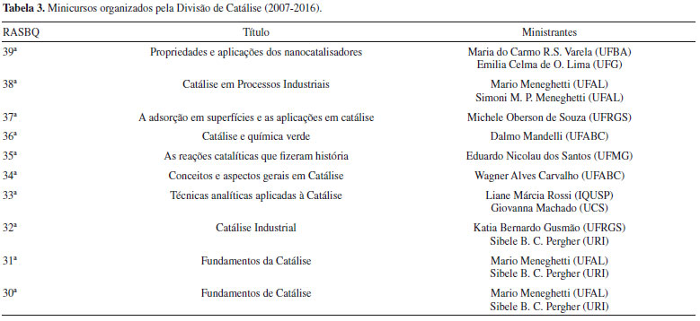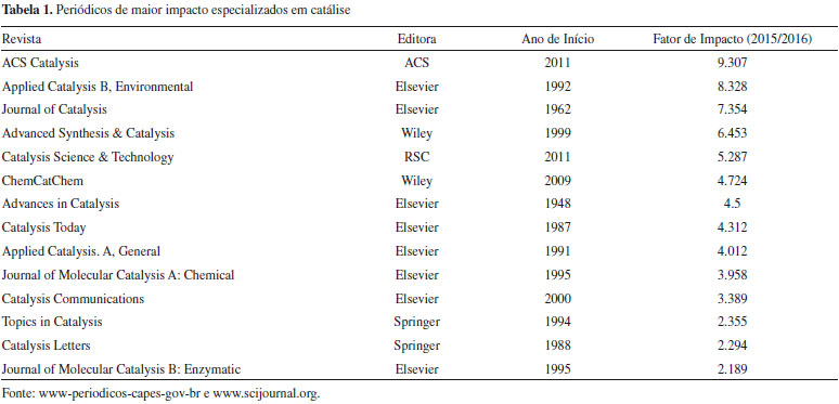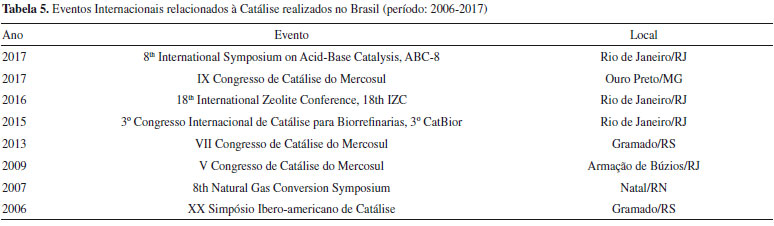 As contribuiçoes sobre o tema em Química Nova e no Journal of the Brazilian Chemical Society (JBCS) no período compreendido entre 2004 e 2006 foram avaliadas e comparadas com jornais especializados em catálise.7 Recentemente, um número do JBCS foi dedicado ao tema de catálise.4 Os autores dedicaram os trabalhos ao Professor Roberto Fernando de Souza do Instituto de Química da UFRGS (homenagem póstuma), que foi um grande entusiasta e promotor do tema no Brasil. O aumento da visibilidade internacional do país na área propiciou a atraçao de eventos científicos internacionais, como pode ser observado na Tabela 5.