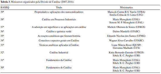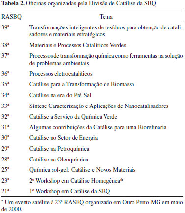 VISAO HISTORICA DA CATALISE NO BRASIL A instalaçao dos parques industriais de refino de petróleo e petroquímica no Brasil se deu nos anos 1960 e 1970 e para essas indústrias a catálise é um tema essencial. Datam desta época os primeiros esforços sistemáticos para o desenvolvimento da catálise como área de pesquisa no Brasil.4 O primeiro Seminário Brasileiro de Catálise foi organizado em 1981 e desde entao vem acontecendo a cada dois anos. Inicialmente o encontro foi organizado pela Comissao de Catálise do Instituto Brasileiro do Petróleo (IBP). Em 1997 o encontro passou a chamar-se Congresso Brasileiro de Catálise e em várias ediçoes foi co-organizado com o Congresso de Catálise do Mercosul. No ano de 2017 será realizada a sua 19ª ediçao em conjunto com o 9º Congresso de Catálise do Mercosul. Paralelamente a este esforço organizacional, em 1983 foi criado um programa de apoio específico à área junto ao CNPq, o Programa Nacional de Catálise, que perdurou 4 anos e foi bastante importante para o desenvolvimento da área junto às universidades. Programas de cooperaçao com a outros países, com destaque para a França e para a Espanha, que capitaneou o Programa CYTED, foram também importantes para a formaçao de recursos humanos na área. Apesar dos esforços e das atividades desenvolvidas na área pela Comissao de Catálise do IBP e das várias ediçoes do Seminário Brasileiro de Catálise, nao havia até 1995 uma sociedade científica brasileira dedicada ao tema. A pesquisa nesta área tem ampla aderência a temas da Química como a cinética química, a química de sólidos e superfícies, a química supramolecular, a química de coordenaçao e organometálica, a química de materiais, a química teórica, entre outros. Quando transposta ao cenário industrial, naturalmente os objetos de estudo da Engenharia Química tais como os fenômenos de transporte de massa e energia, materiais, entre outros, adquirem importância fundamental. Assim, a catálise tem uma forte interface entre a Química e a Engenharia Química. Quando a Sociedade Brasileira de Química começou a organizar-se em divisoes científicas, foi natural a criaçao da Divisao de Catálise da SBQ, dada a importância da área e a sua adesao à Química, o que se deu em 1995. Entretanto, naquela ocasiao, a maioria da pesquisa na área de catálise, sobretudo em catálise heterogênea, se dava na comunidade de engenharia química, cujos membros nao frequentavam as reunioes da SBQ. Os frequentadores do Seminário Brasileiro de Catálise julgaram oportuna a criaçao de uma sociedade científica específica para a catálise e assim foi fundada em 1997 a Sociedade Brasileira de Catálise (SBCat).4 A integraçao dessas duas entidades se deu pela concessao de um assento no conselho consultivo da SBCat ao diretor da Divisao de Catálise da SBQ. As atividades desenvolvidas pela Sociedade Brasileira de Catálise podem ser encontradas na página da internet desta sociedade (www.sbcat.org). Atividades da Divisao de Catálise da SBQ Desde sua fundaçao em 1995, a Divisao de Catálise da SBQ vem tendo participaçao ativa nas Reunioes Anuais da Sociedade Brasileira de Química (RASBQ).5 Esteve entre as pioneiras na organizaçao de oficinas (workshops) pré-reuniao, cujos temas estao listados na Tabela 2.