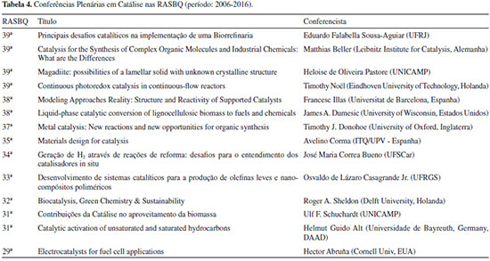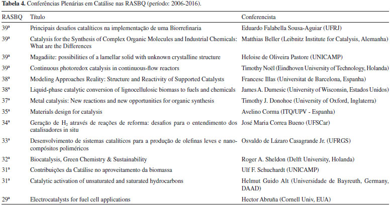 Nas RASBQ podemos observar muitas conferências plenárias com pesquisadores da área de Catálise, o que demonstra a relevância do tema para a SBQ. Muitos destes convites sao frutos da forte inserçao nacional e internacional que os membros da comunidade catalítica apresentam. Alguns exemplos destas Conferências nestes últimos anos estao listados na Tabela 4.