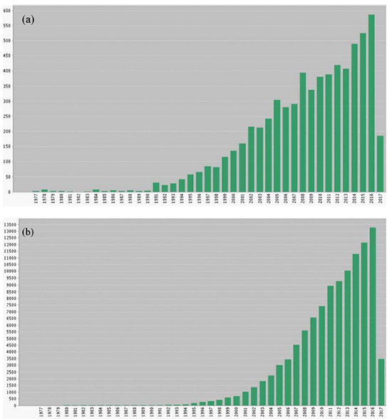Figura 1. Evoluçao da produçao científica em catálise no Brasilª (a) número de artigos, (b) Número de citaçoes. ª critérios de busca no Web of Science: Título: Catalyst* or catalysed or catalyzed + Tópico: catalyst*; Período: 1977-2017; Tipo de documento: article; Pais: Brasil