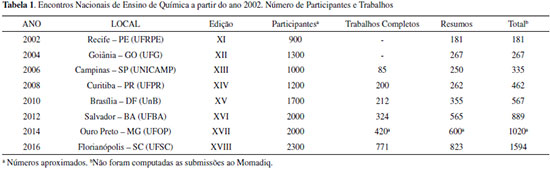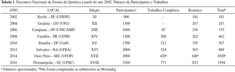 OS ENCONTROS NACIONAIS EM ENSINO DE QUIMICA A partir de 2002, o Encontro Nacional de Ensino de Química (ENEQ) continuou ocorrendo bienalmente. A Tabela 1 sumaria alguns dados sobre os ENEQs. Esses eventos foram, de alguma maneira, apoiados ou chancelados pela DED, seja no que se refere a passagens de convidados ou, ainda, apoio logístico. Tais apoios foram diminuindo ao longo do tempo devido a nao mais existirem projetos específicos da Divisao para a organizaçao de encontros científicos, em decorrência principalmente do acirramento das dificuldades de financiamento para a Ciência, que vêm se agravando ao longo dos anos.