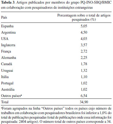 Na publicaçao de 2002 foi observado que um total de 16 universidades federais participou com 36% da produçao científica analisada, enquanto que as universidades estaduais paulistas foram responsáveis por 53%. Nao foram apresentados resultados de outras instituiçoes.1 Na Tabela 2 podemos observar que o universo de instituiçoes que contribuíram para a pesquisa em Química Inorgânica nos últimos 15 anos é amplo, abrangendo todas as regioes do país. Foram elencadas instituiçoes federais principalmente, além de estaduais e algumas poucas privadas. Cerca de 39 universidades federais (as apresentadas individualmente na tabela, bem como aquelas agrupadas na linha "Outras UFs - IFs Variadas" e detalhadas na nota de rodapé "e") somadas a institutos federais variados perfazem um total de cerca de 57,8% de toda a produçao científica analisada. As universidades estaduais sao responsáveis por 38,7% da produçao e as instituiçoes privadas por apenas 3,5% do total. Esse resultado claramente mostra um crescimento nos últimos 15 anos da contribuiçao das universidades federais à pesquisa na área de Química Inorgânica no país. Considerando que houve um crescimento expressivo no número de instituiçoes federais nesse período, algumas inclusive com bons cursos de pós-graduaçao nessa área, esses resultados podem ser parcialmente justificados. No entanto, esse crescimento pode também ser decorrente de uma consolidaçao dos vários grupos de pesquisa e diversos programas de pós-graduaçao nas diferentes universidades federais nesta última década, aliada a um maior aporte financeiro proporcionado no período. Quando se analisa os resultados em termos regionais, observa-se uma distribuiçao da produçao majoritariamente por 5 estados: SP (27,4%), MG (13,6%), RJ (10,4%), PR (11,1%) e RS (5,9%), perfazendo um total de 68,4% do total da produçao analisada. Esse resultado é muito diferente daquele apresentado nos 25 anos analisados anteriormente (1977-2001)1 que mostraram o Estado de SP responsável por 56% da produçao científica em Química Inorgânica, seguido do RS (6,2%) e de MG (6%). Embora a pesquisa atual mostre que a maior porcentagem de pesquisadores ainda é de SP, os dados atuais revelam uma maior consolidaçao das demais regioes e uma melhor distribuiçao geográfica da produçao, indicando que outros estados vêm contribuindo com as pesquisas nessa área de forma mais significativa. Como exemplo pode ser citado o PR, que teve um crescimento expressivo nos últimos 15 anos. No período anterior,1 o estado foi representado pela UFPR com 3,2% da produçao total de trabalhos analisada. Agora, essa mesma universidade foi responsável por 4,7% de todos os trabalhos analisados e o estado como um todo por 11,1%, em grande parte representada pela produçao científica das universidades estaduais, que nao haviam sido avaliadas na primeira análise de 2002. Também aparecem nesta Tabela 2 algumas universidades federais ou estaduais que se destacaram individualmente em termos de publicaçoes neste novo período. Como exemplos, podem ser citadas em SP a UFABC (criada em 2005); em MG a UFJF a UFU e no RJ a UENF e a UFRRJ; responsáveis individualmente por 0,8 a 2,3% do total de publicaçoes. Em todas elas há grupos de pesquisadores da nova geraçao que se mostraram muito atuantes nos últimos anos. As universidades federais UFPE, UFPB, UFC e UFBA, apesar da renovaçao considerável do quadro de docentes de Química Inorgânica observada em algumas delas nos últimos 10 anos, continuam se destacando na produçao científica em Química Inorgânica no Nordeste, sendo responsáveis individualmente por 0,8 a 2,0% do universo de publicaçoes considerado neste levantamento. Talvez nao coincidentemente, essas quatro universidades sao as únicas na Regiao a oferecerem cursos de doutorado em Química desde as décadas de 80 (UFPE) ou 90 (UFC, UFBA e UFPB). Por outro lado, cursos de doutorado em Química foram criados muito recentemente (2015-2016) nas universidades UFPI, UFS e UFRPE, enquanto que no Maranhao sequer há curso de doutorado em Química. Três novos cursos de mestrado em Química foram criados na Bahia, mas estes nao contemplam a área de Química Inorgânica. Na regiao Centro-Oeste, destacam-se a UnB e a UFG. Além disso, nessa regiao, o curso de doutorado em Química na UFMS teve início em 2013, enquanto a UFGD começou a oferecer o curso de mestrado em Química a partir de 2011. O estado de MT nao possui curso de doutorado em Química, tendo o curso de mestrado sido estabelecido recentemente (2010). A baixa produçao da Regiao Norte na área de Química Inorgânica é preocupante e reflete nao apenas a carência de programas de pós-graduaçao em Química na regiao, mas possivelmente um enfoque para outras áreas. Por exemplo, o programa de pós-graduaçao em química da UFRR (mestrado) nao possui a área de concentraçao em Química Inorgânica. A produçao em Química Inorgânica da regiao contabiliza apenas 0,1% no universo analisado. Além disso, constata-se na Tabela 2 a participaçao crescente de universidades privadas em termos de trabalhos publicados, responsáveis por 1,5 % deles no período, sendo que pouco mais da metade deles (0,8%) é devida às chamadas universidades confessionais (PUCs). Ainda dentre as universidades privadas, destaca-se individualmente a UNIFRAN (Universidade de Franca), responsável por 2,0% dos trabalhos publicados no período. Assim, embora lentamente, começa a ser significativa a produçao científica fora das universidades públicas, ao longo desses 40 anos. Apesar dos problemas regionais pontuais, todos estes dados sao promissores, pois atestam uma distribuiçao mais diversificada da produçao científica pelas várias instituiçoes, em várias regioes, e um maior desenvolvimento dos grupos de pesquisa disseminados pelo país. Produçao científica e a cooperaçao internacional Dos trabalhos produzidos pelo grupo PQ-INO-SBQ/BMIC anal