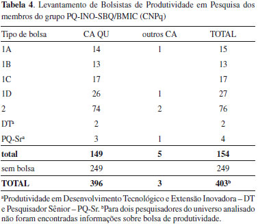 Quando se compara o número de países envolvidos em colaboraçao internacional levantado nos últimos 15 anos (44 países) com aquele verificado no ano de 2002 (valor máximo de 27 países)1 podemos concluir que mais recentemente intensificaram-se os trabalhos de colaboraçao entre pesquisadores brasileiros e estrangeiros. Esse resultado pode ser consequência da maior quantidade de linhas de financiamento federal e estaduais incentivando a saída de estudantes com bolsas-sanduíche e de pesquisadores para estágio de pós-doutoramento. Além disso, o aumento de colaboraçoes internacionais pode também ser resultado do aumento do número de pesquisadores brasileiros frequentando congressos internacionais, bem como a vinda de pesquisadores estrangeiros para participar de conferências nacionais como, por exemplo, as ediçoes do BMIC e das RA-SBQ como já comentado. O programa Ciência sem Fronteiras, financiado pelo CNPq/CAPES, bem como bolsas para estudantes de pós-graduaçao financiadas pela CAPES, com certeza tiveram também papel relevante no envio de estudantes de pós-graduaçao e pós-doutores ao exterior, que iniciaram ou fortaleceram laços de colaboraçao internacional. Cabe destacar também que a internacionalizaçao passou a ser um critério com percepçao de peso maior durante as avaliaçoes recentes dos programas de pós-graduaçao em Química pela CAPES, o que naturalmente se reflete e contribui para a maior internacionalizaçao da produçao científica da Química Inorgânica do Brasil. Recursos Humanos: formaçao e perspectivas futuras No ano de 2002, o número de docentes vinculados a programas de pós-graduaçao na área da Química em todo o país era 922.6 O número de docentes, distribuídos nas categorias permanente, colaborador e visitante, mais que dobrou nos últimos 15 anos, passando a 1885 no ano de 2015.7 Evidentemente, o número de docentes atuantes na área de química nas instituiçoes de ensino superior nao se limita à pós-graduaçao e deve ser, portanto, muito maior. Quanto à formaçao de alunos, até o ano de 2001, 419 mestres e 292 doutores foram titulados.6 No entanto, dados de 2015 indicam 1042 mestres e 584 doutores já titulados na área de química como um todo.7 Embora nao se tenham informaçoes de como esses docentes e titulados estao distribuídos nas várias instituiçoes e grandes áreas da química (QI, QO, FQ e QA), espera-se que esse aumento expressivo observado de 2001 a 2015 contemple de forma análoga ou proporcional a área de Química Inorgânica. Sendo assim, é possível inferir que o número total de químicos inorgânicos titulados também cresceu ao longo dos últimos 15 anos. O documento da área de química 2016, editado pela CAPES,8 mostra que a área da Química conta com 70 programas de pós-graduaçao recomendados em 114 cursos: 66 cursos de Mestrado Acadêmico, 45 cursos de Doutorado e 3 Mestrados Profissionais. Esses cursos estao distribuídos por quase todos os estados e regioes do Brasil, sendo 3 na regiao norte, 17 na regiao nordeste, 7 na regiao centro-oeste, 28 na regiao sudeste e 15 na regiao sul. Apenas os estados do Acre, Rondônia, Amapá e Tocantins nao contam com programas de pós-graduaçao e o programa de pós-graduaçao em Roraima nao contempla a área de Química Inorgânica. A propósito, dos 35 cursos de mestrado acadêmico em Química criados a partir de 2001 e recomendados pela CAPES, apenas 6 (UESB, UESC e UFOB, na BA; UFVJM, em MG; UFRR, em RR) possuem escopo limitado e nao atendem formalmente à área de concentraçao em Química Inorgânica. Todos os 23 cursos de doutorado em Química criados a partir de 2001 contemplam linhas de pesquisa na área de Química Inorgânica. Espera-se que boa parte dos titulados, nos diferentes programas de pós-graduaçao espalhados pelo país, certamente sejam gradativamente absorvidos por essas instituiçoes públicas e algumas das instituiçoes privadas consideradas nessa pesquisa, para garantir uma continuidade na multiplicaçao de pesquisadores com consequente progresso da área. Ao se analisar a formaçao declarada dos pesquisadores considerados nessa pesquisa (Tabela 3S, material suplementar) na plataforma Currículo Lattes do CNPq, pode-se observar que mais de 80% apresentam titulaçao na área de química, sendo cerca de 25% em química inorgânica. Destaca-se, no entanto, que muitos programas de pós-graduaçao nao apresentam a titulaçao específica "química inorgânica" e sim titulaçoes mais gerais, tais como Doutorado em Ciências e Doutorado em Química. A partir das informaçoes declaradas no Currículo Lattes, ou pela ausência de atualizaçao dos dados nessa plataforma de pesquisa (Tabela 4S, material suplementar), é possível estimar que pelo menos 31 pesquisadores do universo analisado já se aposentaram, sendo a maioria com formaçao no período de 1960-1980. No entanto, é possível também afirmar que alguns continuam suas atividades de pesquisa, com bolsa de pesquisador (SR) ou nao. Infelizmente é possível também, a partir da consulta ao Lattes e conhecimento das divulgaçoes efetuadas pelo Boletim da SBQ, afirmar que ao menos 8 pesquisadores, constantes no universo de pesquisadores considerados (405) vieram a falecer no período pesquisado. Os números na Tabela 4S mostram, no entanto, que mais de 42% dos pesquisadores analisados se formaram após 2001, o que aponta para uma carreira acadêmica ainda longa para boa parte do universo de pesquisadores ativos. Ao se levantar o perfil de distribuiçoes de bolsas do CNPq entre os pesquisadores considerados nesse trabalho (Tabela 4), observa-se que 154 pesquisadores sao bolsistas de Produtividade em Pesquisa, sendo a maioria das bolsas distribuídas no CA Química. A partir de uma busca de bolsas vigentes no site do CNPq,9 pode-se concluir que alguns desses pesquisadores provavelmente sao bolsistas da área de Química mas atuantes em alguma das outras grandes áreas, visto que apenas 118 