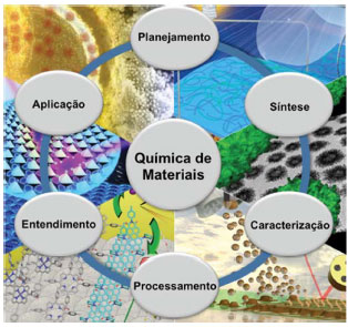 ![]() Figura 1. Ilustraçao representando a definiçao da Química de Materiais. As figuras foram reproduzidas com autorizaçao das capas do J. Mater. Chem. 2012, 22, nº 46-48; J. Mater. Chem. A 2017, 5, nº 11-12 e J. Mater. Chem. A 2017, 28, 12