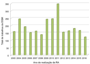 ![]() Figura 2. Total de trabalhos da DQM apresentados nas RAs da SBQ de 2003 a 2016 (média = 190 trabalhos)