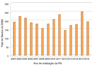 ![]() Figura 3. Total de filiados à DQM de 2003 a 2016 (média = 194 filiados)