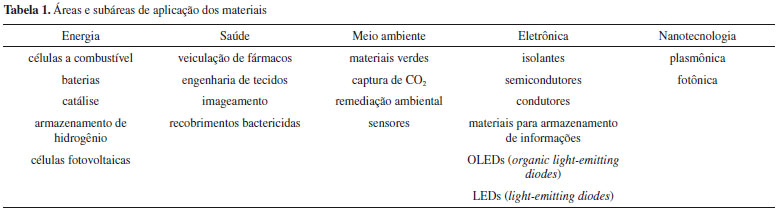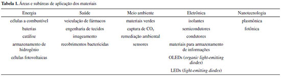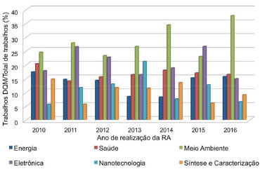 Como mencionado anteriormente, os temas dos trabalhos apresentados na DQM foram organizados por propriedades/funçoes/aplicaçoes, conforme a proposta em discussao no SIQM da IUPAC.34 Foram considerados os seguintes temas para a análise do perfil: materiais para energia, saúde, eletrônica, nanotecnologia e meio ambiente.35 Para cada área de aplicaçao existem diversas subáreas que estao listadas na Tabela 1. Essa análise foi feita para as RAs de 2010 a 2016.