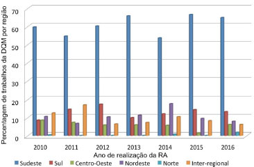 O segundo tema que ocorreu com maior frequência sao os materiais para aplicaçao em eletrônica, principalmente semicondutores e materiais com propriedades luminescentes com potencial aplicaçao em LEDs e OLEDs (Figura 4 e Tabela 1). Os materiais com aplicaçao na área da saúde estao à frente dos materiais para aplicaçao no setor de energia. Como esse último setor envolve o desenvolvimento de materiais para células a combustível, baterias, células fotovoltaicas e catálise, provavelmente, esses trabalhos devem estar distribuídos também nas divisoes de eletroquímica, catálise e fotoquímica, o que dificulta a análise da contribuiçao real da DQM para este setor. Na área de saúde os trabalhos envolvem sistemas de veiculaçao de fármacos, como por exemplo, polímeros, sílicas mesoporosas e nanopartículas magnéticas, polímeros para geraçao de tecidos artificiais, marcadores luminescentes, filmes bactericidas, etc. Finalmente, a área de nanotecnologia cresceu até 2013 contribuindo com 20 % do total de trabalhos da DQM, percentagem que diminui em seguida. A dificuldade maior em classificar os trabalhos nessa área é que muitas vezes os resumos tratam somente da síntese e caracterizaçao de materiais em escala nanométrica, sem determinar ou relacionar suas propriedades com esta escala. Portanto, foi acrescentada na Figura 4 uma coluna extra referente aos resumos que reportaram síntese e caracterizaçao, sem o estudo de propriedades ou indicaçao de aplicaçao dos materiais. Essa coluna corresponde a uma média de 10,2 % do total de trabalhos apresentados na DQM. Geralmente sao trabalhos que propoem novos métodos de síntese ou melhoram sínteses já descritas na literatura, tanto para materiais em escala micro quanto nanométrica. Nota-se que uma grande parte desses trabalhos sao produzidos por alunos no início do mestrado ou doutorado e por alunos de iniciaçao científica (IC), o que é adequado, já que a IC tem como objetivo introduzir o aluno de graduaçao na pesquisa científica. Um dado interessante observado é com relaçao aos trabalhos sobre grafeno. Apesar de esse material ter sido descoberto em 2004, na RA de 2014 foram apresentados poucos resumos de trabalhos com pesquisa em grafeno, sendo que nas RAs seguintes houve um aumento significativo. Destacam-se os grupos de pesquisa dos Estados do Paraná, Minas Gerais e Sao Paulo que vem realizando pesquisas importantes sobre grafeno. Os percentuais de participaçao das regioes do Brasil nas RAs de 2010 a 2016 sao mostrados na Figura 5.