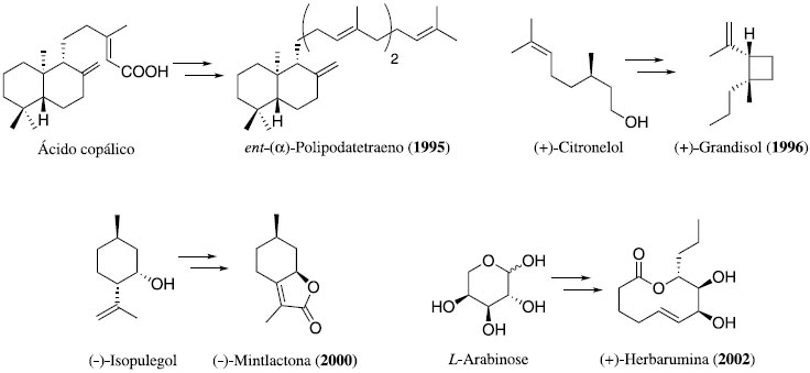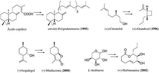 Como seria de se esperar, em funçao da enorme biodiversidade nacional, vários compostos biodisponíveis foram empregados como pool na síntese total de produtos naturais. Um belo exemplo destes primeiros esforços foi a síntese do triterpenoide bicíclico ent-(α)-polipodatetraeno8. O material de partida, o ácido copálico, foi obtido a partir do óleo de copaíba, de origem amazônica e de largo uso medicinal (Esquema 1). Nesta mesma época o (+)-citronelol, empregando química de ciclizaçao intramolecular de carbenoide de uma (α)-diazo-(β)-cetossulfona intermediária, foi transformada no feromônio (+)-grandisol9. Também o (-)-isopulegol, terpeno facilmente obtido a partir do citronelal, foi empregado como material de partida para a síntese da (-)-mintlactona10. A etapa chave da curta síntese foi o emprego de tri-acetato de tálio (TTA) como agente ciclizador. Açúcares também foram empregados como pool quiral. A síntese da herbarumina-I11, uma fitotoxina isolada de fungos, teve como material de partida a L-arabinose. A etapa chave desta síntese foi um acoplamento intermolecular de Nozaki-Hiyama-Kishi.