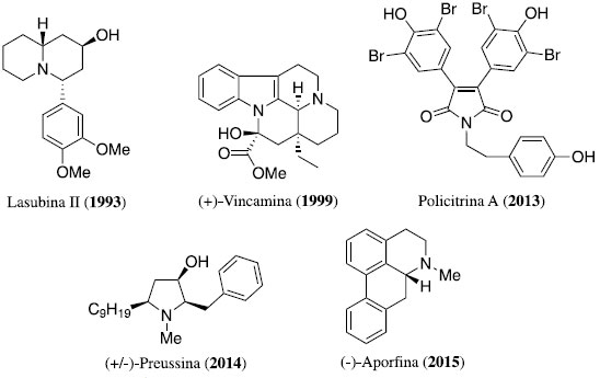 Outra classe de produtos naturais bastante explorada pelos sintéticos brasileiros sao os alcaloides. Uma das primeiras estratégias empregadas na preparaçao destes compostos em solo nacional foi o emprego da reaçao de adiçao a íons N-acil-imínio seguida de uma adiçao de Michael sequencial (estratégia one-pot)18. Apesar de permitir a síntese do produto natural apenas na forma racêmica, representou uma estratégia eficiente na preparaçao do alcaloide quinolizidínico lasubina II (Figura 3). Outra estratégia empregada nas primeiras sínteses totais foi a execuçao de sínteses formais, mas já com controle enantiosseletivo. Para a síntese formal do alcaloide indólico (+)-vincamina19, lançou-se mao do emprego de alquilaçoes derracemizantes empregando iminas quirais, que permitiram a preparaçao de um intermediário em alto excesso enantiomérico (90% ee, medida por RMN de 1H com reagente quiral de deslocamento). A evoluçao nesta área pode ser sentida nos exemplos mais recentes da preparaçao de alcaloides. A policitrina A, por exemplo, foi preparada de maneira muito eficiente através do uso de reaçao de Heck-Matsuda20, que emprega tetra-flúor-boratos de aril-diazônios como substrato, e é reaçao em estudo e desenvolvimento em nosso país e de extenso uso em sínteses totais21. A síntese da (+/-)-preussina também exemplifica a evoluçao da química no Brasil. A preparaçao estereosseletiva da mesma, efetuada em apenas 3 etapas22, teve como material de partida um diazo-oxo-alquilfosfonato desenvolvido em laboratório local23. Já a síntese da (-)-aporfina24 demonstra o domínio de reaçoes de cicloadiçao na preparaçao de estruturas complexas. O esqueleto aporfínico foi construído através de uma cicloadiçao [4+2] entre o benzino e um derivado isoquinolínico, e a síntese foi finalizada através de resoluçao em pequena escala.