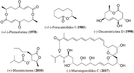 Dentre os alvos sintéticos escolhidos pela comunidade de orgânicos brasileiros, nao poderia faltar a classe dos policetídeos ou oxigenados, onde a presença de hidroxilas, carbonilas e duplas ligaçoes congregam uma grande diversidade de produtos naturais. Um dos exemplos iniciais da capacidade da comunidade sintética nacional em alcançar a construçao destes compostos foi a (+/-)-pirenoforina. Empregando reaçao de alquilaçao de aldeído com ânion gerado a partir de um β-nitro-éster e reaçao de dimerizaçao como etapas-chave25, a síntese racêmica deu início à demonstraçao da capacidade na preparaçao desta classe no Brasil. Aproximadamente na mesma época, o decanolídeo (+/-)-foracantolídeo I também foi preparado26. Uma clivagem oxidativa por nitrosaçao hidrolítica de um precursor bicíclico, metodologia desenvolvida no Brasil, permitiu a construçao do anel carbônico que levou à preparaçao do alvo sintético. Outro decanolídeo preparado no Brasil que demonstrou a capacidade de construçao dessa classe de compostos foi a (-)-decarestrictina D27. A reaçao de Nozaki-Hiyama-Kishi foi empregada na formaçao da ligaçao C-C da lactona, e o estudo da influência dos grupos protetores permitiu controle na formaçao de um novo centro estereogênico e a síntese enantiosseletiva do produto natural. Também a butirolactona (+)-blastmicinona foi preparada pelos "sintéticos" brasileiros. A síntese total do policetídeo envolveu a preparaçao de um organotelureto, seguida de sua resoluçao enzimática28. Esta estratégia permitiu a síntese com excessos enantioméricos superiores à 97%. Contudo, o ápice da demonstraçao da capacidade sintética nacional veio com a preparaçao do (-)-marinisporolídeo C29, a maior e mais complexa molécula já sintetizada no Brasil (Figura 4). Acoplamento cruzado do tipo Stille, olefinaçoes de Takai, Horner-Hadsworth-Emmons e de Julia-Kocienski, reaçao de metátese, reaçoes aldólicas tipo Mukaiyama, tipo Evans e com induçao 1,5-anti, além de ampla manipulaçao de grupos protetores sao exemplos de reaçoes empregadas na preparaçao da complexa molécula, que consolidou de maneira definitiva a grande capacidade nacional neste campo da química orgânica.