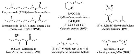 As estratégias de sínteses totais também se desenvolveram sem o uso de fontes naturais de matérias-primas. Uma das classes importantes de compostos naturais sao os feromônios, substâncias importantes no controle de insetos em culturas, e por isso foco de atençao dos químicos sintéticos brasileiros. De fato, devido a nossa pujante agroindústria, uma forte escola de pesquisa sobre feromônios se consolidou no Brasil. Um dos primeiros exemplos foi a preparaçao dos isômeros do propanoato do 8-metil-decan-2-ila, presentes no feromônio sexual da lagarta-da-raiz do milho (Diabrotica virgifera virgifera LeConte). Preparando o substrato inicial através de reduçao enzimática e tomando vantagem de posteriores alquilaçao e hidrogenaçao diastereosseletivas em anéis de tamanho médio, ambos isômeros (2S,8S) e (2S,8R) foram sintetizados12. Os compostos non-6-enoato de metila e o non-6-en-1-ol sao componentes do feromônio de atraçao sexual da mosca-da-fruta do Mediterrâneo (Ceratitis capitata Wiedmann). Partindo de uma cicloexanona substituída e empregando uma reaçao de fragmentaçao de 2-cloro-1,3-dionas, o cloro-éster intermediário obtido foi transformado nos componentes do atrativo do inseto13. Há casos de um único componente que atua como feromônio. É o caso da maria-fedida ou pecervejo-da-soja (Nezara viridula Linnaeus). O sesquiterpeno bisaboleno de estereoquímica (Z)-(1S,2R,4S) foi sintetizado a partir do álcool perílico e empregou uma reaçao de olefinaçao14, bastante comum na preparaçao de insaturaçoes em compostos atrativos de insetos. Outro inseto com componente único no feromônio atrativo que teve seu feromônio sintetizado foi o caruncho-do-fumo (Lasioderma serricorne Fabricius). A estratégia quimioenzimática empregada na preparaçao da serricornina15 envolveu o uso de fermento de padaria (S. cerevisiae). Há também uma vertente comercial na síntese de feromônios. Por exemplo, a preparaçao do feromônio de agregaçao da broca-do-olho-do-coqueiro (Rhynchophorus palmarum Linnaeus), que envolveu apenas uma etapa de adiçao de composto de Grignard a um aldeído16, permitiu a criaçao de um núcleo de estudos e uma incubadora dentro de uma universidade, de onde o composto é fornecido em escala. Por fim, como prova da evoluçao da comunidade brasileira nesta área, o feromônio do besouro-soldado (Chauliognathus fallax Germar), além de ter sido sintetizado, foi também identificado em nosso país17. Uso extensivo de métodos analíticos como eletroantenografia, cromatografia gasosa, espectrometria de massas e espectroscopia no infravermelho permitiu a identificaçao do (Z)-tricos-11-eno, que foi entao sintetizado e confirmado como composto atrativo da espécie (Figura 2).