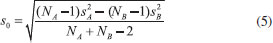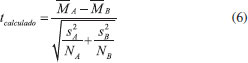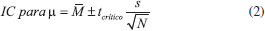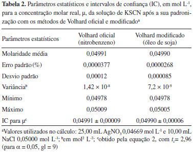 RESULTADOS E DISCUSSAO A estimativa da concentraçao molar exata real (µ) da soluçao de KSCN obtida pelos métodos de Volhard oficial (A) e modificado (B), assim como de outros parâmetros populacionais foi realizada mediante o uso de técnicas de estatística inferencial. O teste t de student foi utilizado para determinar µA e µB dentro do intervalo de confiança (IC), a um nível de significância (α) de 0,05, aplicando a equaçao 2. Os resultados obtidos para os dois métodos estao apresentados na Tabela 2.