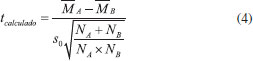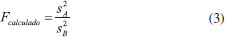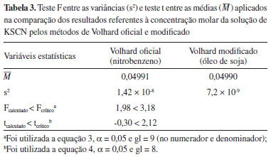 ![]() em que: µ é a concentraçao molar real (µA ou µB); A homogeneidade das variâncias (s2) dos métodos de Volhard oficial e modificado foi avaliada empregando o teste estatístico F, em que o valor de Fcalculado equaçao 3) foi comparado com o valor de Fcrítico ![]() em que sA2 e sB2 sao as variâncias do método oficial e modificado, respectivamente. Como o valor de Fcalculado foi menor que o Fcrítico (Tabela 3), nao houve diferença significativa na homogeneidade das variâncias entre os dois métodos ao nível de confiança de 95%. Portanto, as precisoes estimadas para os dois métodos nao diferiram estatisticamente entre si.
