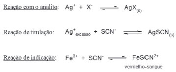 ![]() Figura 2. Reaçoes do íon Ag+ com o analito (X-) e com o titulante (SCN-) e reaçao de indicaçao do ponto final da titulaçao que ocorrem no método de Volhard