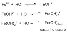 ![]() Figura 3. Reaçoes de formaçao dos hidróxi-complexos de Fe3+ e precipitaçao do Fe(OH)3 evitadas pela acidificaçao da soluçao titulada