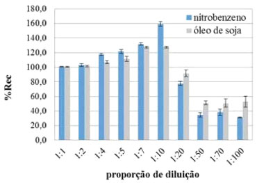 ![]() Figura 4. Porcentagens de recuperaçao ± desvio-padrao (%Rec ± s) obtidas pelo método de Volhard oficial (nitrobenzeno) e modificado (óleo de soja) após a titulaçao de alíquotas de 10,00 mL de soluçao de NaCl 0,07000 mol L-1 submetidas a diferentes diluiçoes. Valores utilizados nos cálculos: 25,00 mL AgNO3 0,04894 mol L-1, KSCN 0,04960 mol L-1 (método oficial) e KSCN 0,05008 mol L-1 (método modificado)
