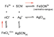 ![]() Figura 5. Esquema dos equilíbrios envolvidos na soluçao titulada pelos métodos de Volhard oficial e modificado. n = 1 ou 2, para a formaçao dos cloro-complexos de ferro. Em vermelho está ilustrado o efeito da diminuiçao da concentraçao do Cl- nos equilíbrios de formaçao dos complexos FeCln+3-n e FeSCN2+