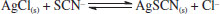 Além de eliminar as interferências, o meio fortemente ácido tem a funçao de evitar a formaçao de hidróxi-complexos de Fe3+, além de prevenir a precipitaçao do indicador como hidróxido férrico, cuja coloraçao catanho-escura dificultaria a visualizaçao do ponto final. O método de Volhard tem sido empregado como método de referência na determinaçao de cloreto na análise de diversos tipos de amostras como carnes e derivados (AOAC O. M. 935.47),7 cerveja (AOAC O. M. 940.18),7 laticínios (AOAC O. M. 935.43),7 óleos lubrificantes e combustíveis (ASTM E 776),8 plantas (AOAC O. M. 915.01),7 peixes e produtos marinhos (AOAC O. M. 937.09),7 vinhos (AOAC O. M. 966.10),7 reagentes químicos (ASTM E 291),8 etc. Contudo, para estas determinaçoes, este método apresenta como um inconveniente o fato de a solubilidade do AgCl (1,34 x 10-5 mol L-1, 25 ºC) ser cerca de 13 vezes maior que a do AgSCN (1,05 x 10-6 mol L-1, 25 ºC), permitindo a reaçao do tiocianato com uma fraçao do AgCl precipitado pelo AgNO3, segundo a reaçao ![]()