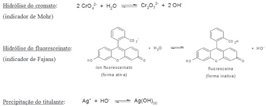 O primeiro método emprega íons CrO42- como indicador, que precipita com os íons Ag+ nas imediaçoes do ponto de equivalência, enquanto que o de Fajans utiliza um indicador de adsorçao (fluoresceína, diclorofluoresceína, rodamina 6G, eosina, etc) cuja forma desprotonada compete com o analito pelo sólido formado, adsorvendo-se ao mesmo somente quando a concentraçao de analito for suficientemente baixa.3,4 Ambos os métodos devem ser empregados apenas na titulaçao de soluçoes com pH na faixa de 6,5 - 10,5 (ou mais estreita, dependendo da amostra) para evitar a hidrólise básica do indicador (pH < 6,5) ou a precipitaçao do titulante como Ag(OH) (pH > 10,5),2 conforme as reaçoes representadas na Figura 1.