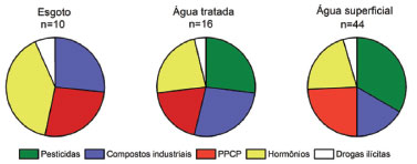 A Figura 1 mostra o número de trabalhos publicados em revistas indexadas por classes de compostos nas principais matrizes ambientais estudadas no Brasil: esgoto, água de abastecimento público e águas superficiais. Os hormônios, seguidos pelos fármacos e produtos de higiene pessoal (PPCP, do inglês, Pharmaceuticals and Personal Care Products), compostos industriais e os pesticidas foram as classes mais estudadas. No caso dos pesticidas, as escolhas dos compostos de interesse seguiram o padrao de consumo de cada regiao considerando os princípios ativos mais usados nas culturas locais. Para as outras classes, a escolha dos contaminantes seguiram a tendência mundial e acompanharam os compostos considerados prioritários por agências ambientais americana e europeia.