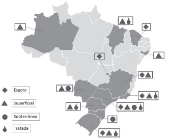 ![]() Figura 2. Mapa do Brasil com destaque para as regioes em cinza escuro onde foram estudadas a presença de pelo menos uma classe de contaminantes emergentes nas matrizes: (♦) esgoto, (▲) água superficial, (●) água subterrânea, e ( ) água tratada