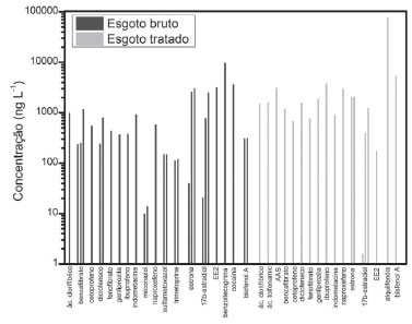![]() Figura 3. Concentraçao máxima dos contaminantes emergentes determinados nos esgotos domésticos bruto e tratado no Brasil de acordo com os dados apresentados na Tabela 1S