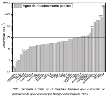 A Cromatografia Líquida acoplada à Espectrometria de Massas sequencial (LC-MS/MS) empregada a partir de 2010 para análises de águas tratadas no Brasil foi usada em 10 dos 16 trabalhos incluídos nesta revisao. Esta tem sido considerada a ferramenta analítica mais adequada para análise de traços em amostras de água tratada devido a elevada detectabilidade e exatidao das medidas. Foram 92 compostos determinados por essa técnica cuja as concentraçoes variaram entre 0,2 e 652 ng L-1 para os 27 contaminantes quantificados e, entre 1,8 e 5800 ng L-1 para a cafeína.7,19,24 Os estudos envolvendo esta matriz sao os mais recentes dentre as matrizes aquáticas e foram impulsionados com os avanços das tecnologias analíticas desde o preparo de amostras até a parte instrumental. Além destes trabalhos, Delmonico e colaboradores determinaram glifosato e ácido aminometilfosfônico (AMPA) em concentraçoes entre 2100 e 3300 ng L-1 empregando Cromatografia Líquida de Alta Eficiência acoplada ao detector de ultravioleta (HPLC-UV) em amostras de água tratada oriundas do Rio Pirapó em Maringá (PR).31 Silva e colaboradores determinaram cinco compostos orgânicos usados em protetores solares dentre os quais, quantificaram benzofenona-3 (18 - 115 ng L-1) e metoxicinamato de etilhexila (57 - 75 ng L-1) em amostras de água tratada coletadas em cidades do interior do estado de Sao Paulo empregando Cromatografia Gasosa acoplada à Espectrometria de Massas sequencial (GC-MS/MS).25 Rissato e colaboradores determinaram 6 pesticidas organoclorados (BHC, aldrim, dieldrin, DDT, endossulfan e heptaclor) em amostras de água tratada da cidade de Bauru (SP) em concentraçoes que variaram entre 8 e 33 ng L-1 utilizando cromatografia gasosa de alta resoluçao com detector de captura de elétrons (HRGC-ECD), o qual apresenta detectabilidade adequada à análise de resíduos de compostos voláteis ou semi-voláteis, como sao esses analitos de interesse.30 E, finalmente, Stumpf e colaboradores, em seu trabalho pioneiro para o Brasil, determinaram 15 DBP incluindo compostos neutros e ácidos em concentraçoes entre 100 e 41000 ng L-1 empregando GC-ECD, e determinou EDTA em concentraçoes de 2000 ng L-1 empregando cromatografia gasosa com detector de nitrogênio-fósforo (GC-NPD) em amostras de água tratada oriunda da Lagoa de Juturnaíba na Regiao dos Lagos (RJ).3 Dos 16 trabalhos descritos na literatura para água tratada no Brasil, 10 sao provenientes do Estado de Sao Paulo,18-21,23,25-27,29,30 2 sao do Rio Grande do Sul,24,28 1 do Paraná,31 1 do Rio de Janeiro3 e 1 do Maranhao,22 (Figura 2) além do trabalho de Machado e colaboradores que fez uma amostragem em 21 capitais estaduais e no Distrito Federal.7 Neste trabalho, a cafeína foi detectada em 93% das amostras e as concentraçoes variaram entre 1,8 e 2769 ng L-1. Para as capitais onde se encontrou a maior concentraçao de cafeína (Sao Paulo, Porto Alegre e Belo Horizonte), os mananciais também foram amostrados e as concentraçoes de cafeína variaram entre 40 e 19000 ng L-1, nas quais também foram detectados o herbicida atrazina e o bisfenol A. Outros compostos de preocupaçao emergentes foram investigados nestas amostras de águas tratadas sendo, fenolftaleína, triclosan e atrazina detectados em pelo menos uma amostra. A atrazina foi determinada em todo o território nacional, com uma frequência de detecçao de 75% e concentraçao média nas capitais que variou de 2 a 15 ng L-1, cerca de 1000 vezes menor que o Valor Máximo Permitido (VMP) pela Portaria do Ministério da Saúde 2914/2011, que trata sobre a potabilidade.7 Apesar de regulamentada, a atrazina está incluída dentre os contaminantes de preocupaçao emergentes devido ao seu potencial estrogênico, o qual tem sido melhor elucidado nesta última década e, portanto, nao foi contemplado nos cálculos dos VMP vigentes atualmente. O Institute of Environment and Health (IEH) da Cranfield University no Reino Unido publicou uma revisao dos dados mais recentes sobre as implicaçoes da presença de compostos interferentes endócrinos em água tratada (Final Report DWI:70/2/266). Para tal, tiveram como base 509 artigos e 325 diferentes compostos que foram priorizados, o que gerou uma lista com 159 substancias, para as quais os riscos foram avaliados usando dados de ocorrência ou modelos matemáticos capazes de prever as concentraçoes após o tratamento considerando as características físico-químicas dos compostos e o tipo de tratamento empregado nas estaçoes de tratamento de água (ETA). Os perfis de perigo foram desenvolvidos para caracterizar a natureza de qualquer risco para a saúde humana relacionado ao consumo de água potável para as substâncias determinadas em concentraçoes maiores que 100 ng L-1, considerada pelos autores como o pior cenário.32 A Figura 4 mostra que houve compostos interferentes endócrinos quantificados acima desta concentraçao nas amostras de água tratada do Brasil. A temática dos interferentes endócrinos será discutida mais adiante nesta revisao. Nas ETA o tratamento convencional utiliza processos físico-químicos para tornar a água potável, ou seja, para o Brasil, a água que está sendo servida à populaçao deve estar em conformidade com os parâmetros descritos na Portaria do Ministério da Saúde MS 2.914/2011. A etapa de clarificaçao é feita com floculadores, decantadores e filtros; a desinfecçao é feita usando cloradores e aminoadores a depender do processo que está sendo aplicado na planta e as características do manancial e, finalmente o polimento que consiste no ajuste de pH, correçao do cloro residual e a fluoretaçao (que é um aditivo usado no Brasil para evitar a incidência de cáries na populaçao). Um panorama do sistema de abastecimento de água em diversas capitais do país é descrito por INCTAA.6 Assim como nas ETE, os processos convencionais de tratamento nas ETA nao sao eficientes para a eliminaçao de inúmeros cont