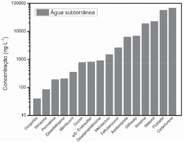 ![]() Figura 5. Concentraçoes dos pesticidas quantificados em pelo menos uma amostra de água subterrânea do Brasil de acordo com os dados descritos na Tabela 1S