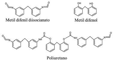 ![]() Figura 1. Estructuras de Metil difenil diisocianto, metil difenol y poliuretano