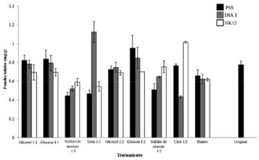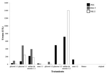 Al evaluar las actividades enzimáticas, la actividad ureasa estuvo presente en todas las muestras, viéndose particularmente incrementada en el caso del tratamiento con sulfato de amonio en relación 1:2 (Figura 3). En el caso de las actividades esterasa y ureasa fueron detectadas en el tratamiento con poliuretano como única fuente de nutrimentos para los hongos, por lo que la producción de biomasa puede deberse a otra actividad enzimática o la actividad era muy pequeña como para ser detectada mediante la técnica empleada. No se detectaron actividades lacasa o proteasa en ninguno de los tratamientos. Otra posible explicación es que estos análisis fueron realizados a los 30 días de cultivo, así que es posible que las actividades enzimáticas estuvieran presentes antes en el cultivo. Estudios previos por otros autores, indican que la actividad ureasa es mayor antes de la liberación de los fenoles y que cuando estos eran detectados, la actividad disminuía,27 probablemente debido a que primero se producían las enzimas para actuar sobre el polímero y luego podrían ser degradadas. Esto también se observó en un estudio previo realizado por este grupo de trabajo.20