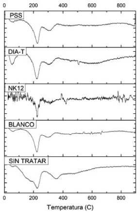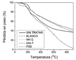 No se detectó actividad esterasa cuando el poliuretano fue la única fuente de nutrimentos, detectándose sólo en el caso de emplear como nutrimento adicional sulfato de amonio en relación 1:2 con el poliuretano, seguido por el tratamiento con urea en la misma relación. No se encontró actividad importante en los otros tratamientos. La presencia y actividad de estas enzimas puede ser explicada porque algunas enzimas, a pesar de su especificidad, tienen cierta flexibilidad y son capaces de actuar sobre sustratos en los que normalmente no actúan. Es importante mencionar este comportamiento de inespecificidad enzimática porque cuando se trata de nuevos materiales en la naturaleza, los microorganismos deben adaptar sus mecanismos enzimáticos más que producir nuevas enzimas específicas.4,10 Análisis termogravimétricos (TGA) y de infrarrojo (FTIR) Para corroborar la degradación del poliuretano se llevaron a cabo análisis térmicos de TGA y espectroscópico de FTIR para identificar cambios estructurales del polímero. Los resultados de TGA (Figura 4) muestran la estabilidad térmica PU sin ningun tipo de tratamiento ("Sin tratar" en la figura) el PU Blanco ("Blanco" en la figura), y los tres tratamientos con las cepas fúngicas.