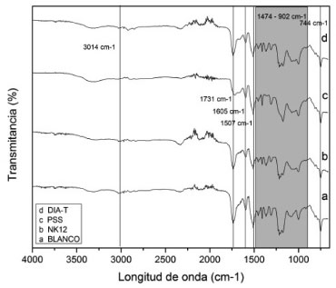![]() Figura 6. FTIR del PU tratado con hongos y sin tratar. a) Blanco; b Paece lomyces NK12 con glucosa); c)Aspergillus PSS con glicerol; d) Trichoderma DIA-T con glucosa