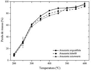 ![]() Figura 2. Perda de massa das amostras submetidas ao processo de queima em mufla para as espécies Araucaria angustifolia, Araucaria bidwillii e Araucaria columnaris na faixa de temperatura de 200 °C a 600 °C