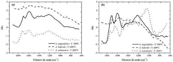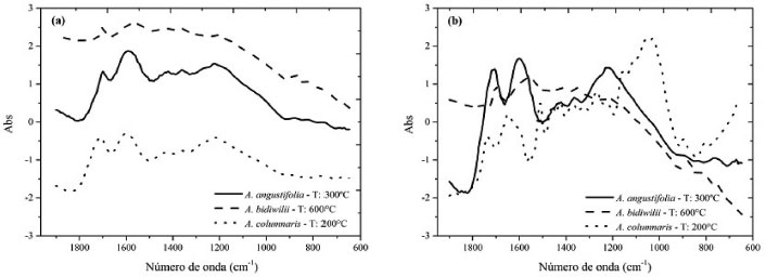 Observa-se, na Figura 2, eventos térmicos similares e que apresentaram médias de perda de massa durante o processo de termodegradaçao a 600 ºC de 96,34%, 91,60% e 94,03% para as espécies A. angustifolia, A. bidwillii e A. columnaris, respectivamente, sendo que apenas a diferença entre as espécies A. angustifolia e A. bidwillii mostrou-se estatisticamente significativa (p < 0,05). No intervalo inicial, de 200 ºC a 300 ºC, os lenhos apresentaram a maior perda de massa. Os resultados médios para as perdas de massa foram 50,57% para A. angustifolia, 53,21% para A. bidwillii e 48,35% para A. columnaris. No intervalo de 300 ºC até 450 ºC ocorre uma diminuiçao na perda de massa para as três espécies se comparado aos dois estágios anteriores, apresentando perdas de massa de 27,39%, 23,06% e 22,59%, respectivamente, para as espécies A. angustifolia, A. bidwillii e A. columnaris. De forma análoga aos resultados apresentados na Figura 1, os lenhos secos in natura analisados nao receberam tratamento térmico que antecedesse as análises físicas e químicas. Através da proposiçao da metodologia de carbonizaçao dos lenhos in natura em mufla para as espécies A. angustifolia, A. bidwillii e A. columnaris, observou-se que a A. angustifolia foi a que mais perdeu massa, sucedida da A. columnaris e A. bidwillii, sendo que a maior perda de massa se deu entre 250 ºC e 300 ºC. Concomitantemente nessa faixa de temperatura houve a mudança de coloraçao dos lenhos carbonizados artificialmente de marrom escuro para preto. Ao reduzir o teor de umidade das amostras, inicia-se o processo de decomposiçao da estrutura molecular dos lenhos. A umidade da biomassa provém da água, que faz parte da composiçao da estrutura macro do lenho e está ligada às paredes de celulose. A perda dessa água causa tensao na estrutura molecular e se manifesta macroscopicamente pela mudança da sua coloraçao para preto.42 As variabilidades das características (tamanho e a forma do lenho, umidade e a razao de aquecimento) que ocorrem no processo de carbonizaçao do carvao sao fatores que influenciam no processo de formaçao do mesmo.43 Além de que o lenho, por ser um polímero natural, quando submetido ao fogo, sofre despolimerizaçao e carbonizaçao, alterando suas propriedades mecânicas conforme o nível de temperatura e tempo de exposiçao ao calor ao qual foi submetida.44 Ainda, alguns autores citam que as variaçoes de massa entre as espécies e dentre a mesma espécie podem ocorrer em funçao da diferença de idade entre os indivíduos,45,46 fato este observado no detalhe apresentado na Figura 1. Ressalta-se que os dois processos térmicos, termodegradaçao em mufla e em termogravimetria, sao distintos e nao comparativos, uma vez que em mufla as amostras foram carbonizadas em uma atmosfera autogerada com próprios gases liberados na carbonizaçao, condiçao contrária à das amostras carbonizadas por termogravimetria, em que as amostras sao cuidadosamente pesadas enquanto sofrem o processo de termodegradaçao em um ambiente isento de oxigênio, com controle de gás inerte e razao de aquecimento programada a fim de obter medidas térmicas para as três espécies avaliadas. Representaçao dos grupos funcionais por FTIR Representando um conjunto de dados de 81 espectros, 3 espectros sao exibidos nas Figuras 3a e 3b na regiao espectral de 1900 e 650 cm-1. Considerou-se para a escolha dos mesmos as temperaturas que exibiram alteraçoes mais significativas nos espectros por faixa de temperatura e por espécie avaliada.