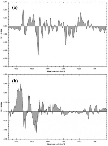 ![]() Figura 5. Loadings da componente principal 1 (a) e da componente principal 2 (b) para as amostras de lenhos carbonizados artificialmente em mufla para as três espécies de Araucariaceae avaliadas