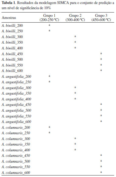 MATERIAL SUPLEMENTAR No material suplementar, disponível em http://quimicanova.sbq.org.br na forma de arquivo PDF, com acesso livre, encontra-se o detalhamento dos principais picos dos espectros presentes na Figura 3b (Tabela 1S). A representaçao dos scores para PC1 versus PC2 para as amostras de lenhos carbonizados artificialmente em mufla para a Araucaria angustifolia, Araucaria bidwillii e Araucaria columnaris estao apresentadas na Figura 1S.