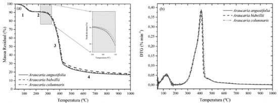 Figura 1. Medidas termogravimétricas das espécies Araucaria angustifolia, Araucaria bidwillii e Araucaria columnaris com razao de aquecimento de 25 °C min-1 e faixa de temperatura de aquecimento de 25 °C a 995 °C (curvas TG) com regioes 1,2 (detalhe em zoom), 3 e 4 destacados (a) e curvas DTG (b)