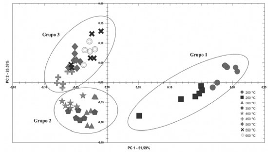A análise do gráfico dos scores (Figura 4) mostra as amostras separadas em diferentes grupamentos. A PC1 separa as amostras com temperaturas de carbonizaçao abaixo de 250 ºC (grupo 1) em valores positivos ao longo do vetor, das amostras cuja carbonizaçao foi realizada acima de 300 ºC, que possuem valores negativos ao longo desta PC. Essa separaçao se dá principalmente devido às variaçoes na altura dos sinais de log (1/R) situados próximos a 1713 cm-1, 1522 cm-1, 1171 cm-1 e 982 cm-1. Isto se torna mais evidente ao se analisar o gráfico dos loadings referentes à PC1 (Figura 5). Os maiores valores absolutos de log (1/R) para os loadings da PC1 localizam-se nas regioes espectrais próximas a 1710 cm-1, 1520 cm-1, 1170 cm-1 e 980 cm-1. O distanciamento entre as amostras carbonizadas a 250 ºC pode estar atrelado ao maior desvio observado para os valores de perda de massa apresentados na Figura 2.