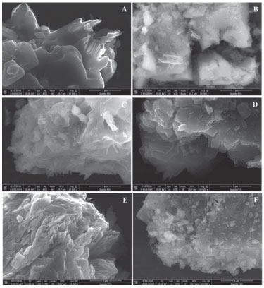 ![]() Figura 3. Micrografias das amostras de eflorescência salina (A) SJ04.04, (B) SJ04.06, (C) SJ04.07, (D) SJ05.04, (E) SJ05.05 e (F) SJ05.06 com detalhes em aumento de 10.000x