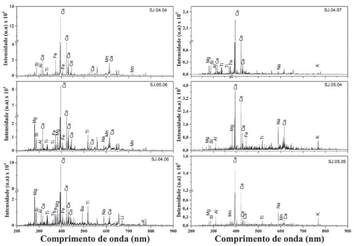 A amostra SJ04.04 revela uma morfologia de estrutura densa e compacta e muitos pontos em formato de agulha. Contrariamente, as amostras SJ04.06 (Figura 3B), SJ04.07 (Figura 3C) e SJ05.06 (Figura 3F) apresentam no formato de uma massa densa, bem como alguns graos de formato retangular e outros arredondados ao longo de sua superfície. É possível observar também nas amostras SJ05.04 (Figura 3D) e SJ05.05 (Figura 3E) um aspecto morfológico bastante semelhante na forma de várias estruturas planas retangulares que se sobrepoem e formam camadas laminares. Embora poucos detalhes foram possíveis de serem observados nas micrografias das amostras, conhecer a morfologia através de técnicas de exame permitiu fornecer informaçoes de materiais que venham estar agregados aos depósitos minerais e com isso dificultar a interpretaçao dos resultados baseados na análise qualitativa. A Figura 4 mostra os resultados da análise qualitativa das amostras com os principais sinais de emissao e seus respectivos elementos químicos que foram obtidos, realizando um exame minucioso de toda a faixa espectral obtidos por LIBS.