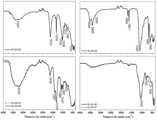 Foram selecionadas apenas as linhas de emissao mais intensas para realizar a caracterizaçao química da amostra. A linha de emissao de maior intensidade para todas as amostras refere-se ao Ca II em 396,8 nm e presentes também em 315,91 nm, 422,70 nm, 430,24 nm, 445,50 nm, 534,96 e 616,26 nm. Esse resultado pode ser responsável, em parte, pela composiçao química-mineralógica das eflorescências salinas, resultado da reaçao dos ânions solúveis que migram do interior da rocha (sulfatos, carbonatos e outros), bem como de substâncias químicas, como o ácido húmico (liberadas pelas raízes de plantas), que formam os agregados salinos. A Figura 4 mostra ainda outros componentes presentes nas amostras, uns de caráter majoritários e outros em nível de traços. Foram detectadas claramente as linhas de emissao atômica do Na I (dupleto em 588.99 e 589.59 nm), Si I (288, 17 nm), Al I (309,31 nm) e Fe II (573,73 nm; 404,59 nm e 445,49 nm)). Esses resultados estao em concordância com a composiçao de uma infinidade de eflorescências salinas já estudadas, oriundas de fontes da construçao civil,4 arquitetônica histórica,5 obras de arte e arqueológicas.5,6 Além disso, os elementos como Si e Al podem estar associados diretamente à composiçao do suporte rochoso que sao também compostos de aluminossilicatos. Elementos como Mg I (279,56 nm e 383,20 nm), Ti II (336,11 nm; 368,52 nm e 518,39 nm), K I (766,49 nm), Mn I (714,88 e 612,27 nm), Li I (670,73 nm) e Ba I (493,41 nm) podem estar associados a impurezas contidas nas amostras, uma vez que se trata de um sítio arqueológico a céu aberto e, por isso, as açoes ambientais como o vento, que arrastam materiais até as paredes rochosas e acabam se depositando, sao bastante atuantes. A caracterizaçao química utilizando a técnica LIBS foi fundamental para realizaçao do levantamento inicial dos principais elementos químicos presentes nas amostras. Assim, para a caracterizaçao completa dos depósitos minerais foi elegida a técnica FTIR, que em conjunto com o LIBS forneceu a caracterizaçao químico-mineralógica completa da amostra, permitindo assim os trabalhos de conservaçao de arte rupestre. Na Figura 5 sao apresentados os espectros FTIR das amostras de eflorescências salinas coletadas no paredao rochoso do sítio arqueológico Toca do Exú do Jurubeba. As análises espectrais FTIR revelaram que pelo menos três compostos fazem parte do conjunto de amostras analisadas e que algumas delas já estao em estado de silicificaçao, devido à presença marcante de modos vibracionais do SiO2 ou da mistura com fragmentos rochosos que vêm aderido aos depósitos de eflorescências salinas.