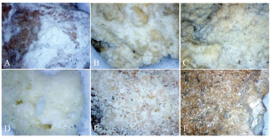 Figura 2. Exames sob microscopia óptica das amostras de eflorescência salina (A) SJ04.04, (B) SJ04.06, (C) SJ04.07, (D) SJ05.04, (E) SJ05.05 e (F) SJ05.06 com detalhes em aumento de 50x