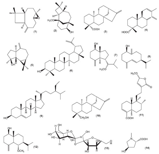 RESULTADOS E DISCUSSAO As estruturas dos compostos isolados foram elucidadas usando espectroscopia de IV, RMN de 1H e 13C e ainda estudos bidimensionais de RMN. Estes dados foram comparados com os dados da literatura de cada um dos compostos identificando o óxido de cariofileno (1),6 1β-metoxicariolan-9β-ol (2),14,15 ácido kaur-16-en-19-oico (3),16 ácido cis-ozoico (4),17,18 espatulenol (5),19-21 lupeol (6),22 7δ-metoxi-opposit-4(15)-en-1β-ol (7),23,24 germacra-4(15),5,10(14)-trien-1β-ol (8),25,26 β-sitosterol (9),27ent-kaur-16-en-18-ol (10),16 ácido 15-metoxi-neo-clerodan-3,13-dien-16,15-olid-18-oico (11),28-30 6α-metoxieudesm-4(15)-en-1β-ol (12),31 sacarose (13)32 e a N-metil-trans-4-hidroxi-L-prolina (14) (Figura 1).33