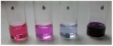 ![]() Figura 1. Cores das substâncias puras e cores formadas da mistura de cro móforos e da diferença de concentraçoes dos mesmos, onde: (a) p-rosanilina; (b) uma mistura de p-rosanilina e o aduto aminosulfonado; (c) o aduto ami nossulfonado; e (d) aduto aminossulfonado em maior concentraçao. Note que a cor de b corresponde à mistura de a e c